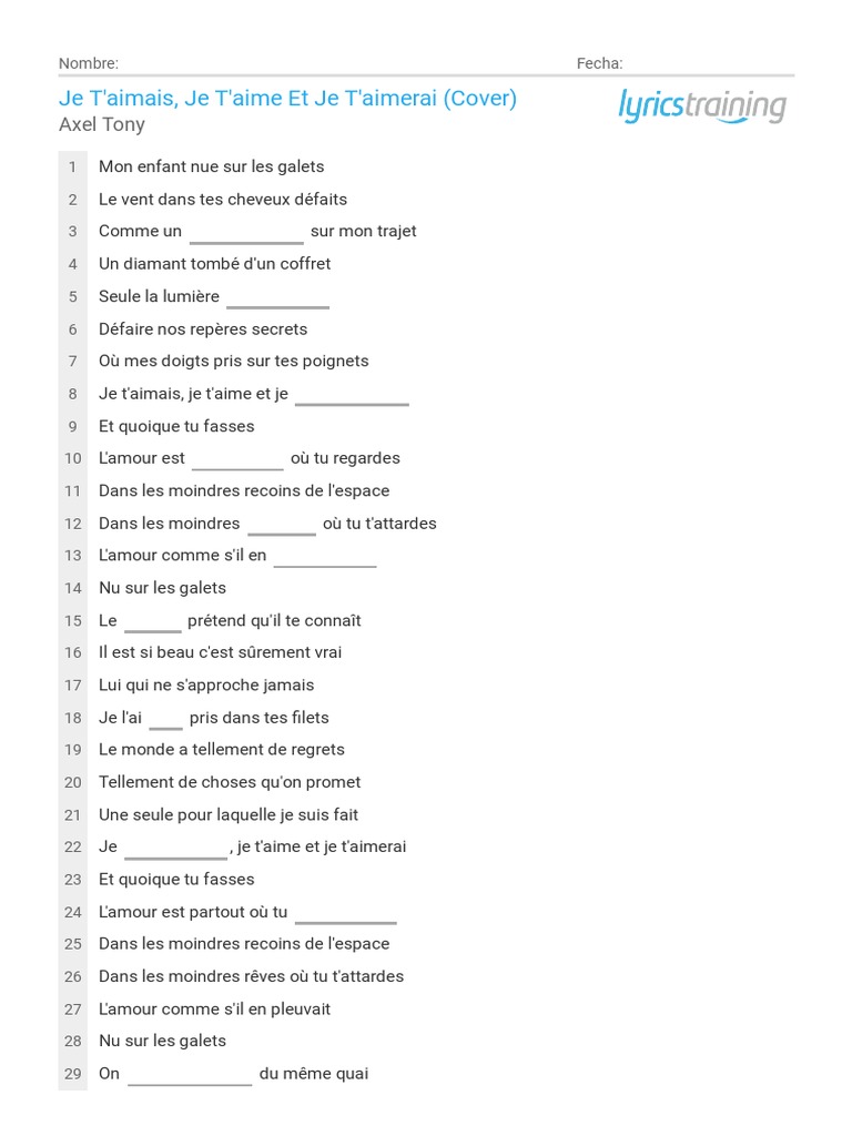 Dans les moindres recoins de l'espace et mes doigts pris sur tes poignets, je t'aimais, je t'aime et je t'aimerai. Je t aimais je t aime et je t aimerai francis cabrel. The song was written by cabrel and is taken from his 1994 album.